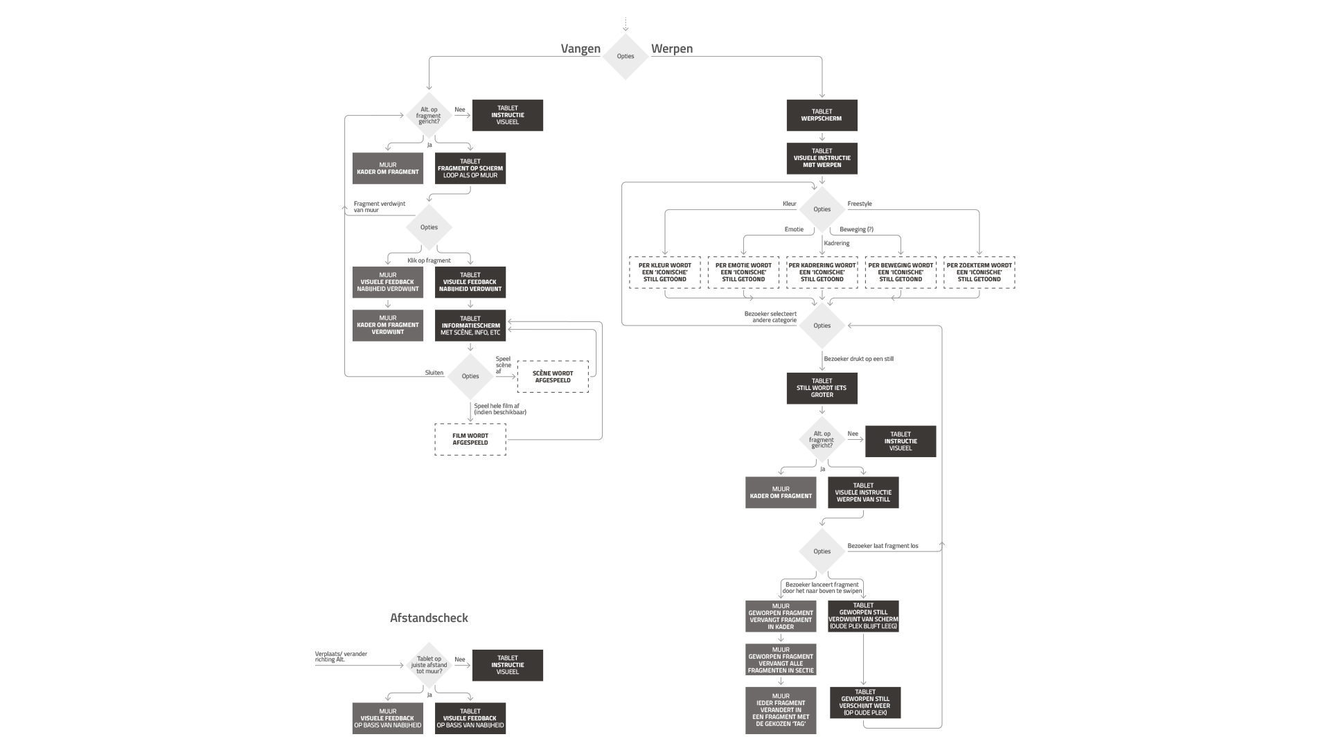 Throw A grid of selectable fragments (stills) appears. By pressing a fragment and swiping it towards the wall, the fragment is sent and appears on the wall. This and associated videoclips are loaded and shown by the algorithm based on non-semantic search.
